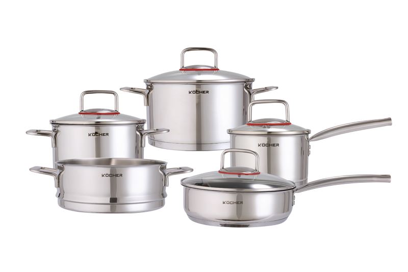 Bộ nồi Kocher Berlin gồm 5 món: 1 nồi luộc gà có đường kính 24cm, 1 nồi 20cm, 1 quánh 16cm, 1 chảo chống dính 24cm và 1 xửng hấp 24cm sẽ đáp ứng mọi nhu cầu nấu ăn cho gia đình bạn.