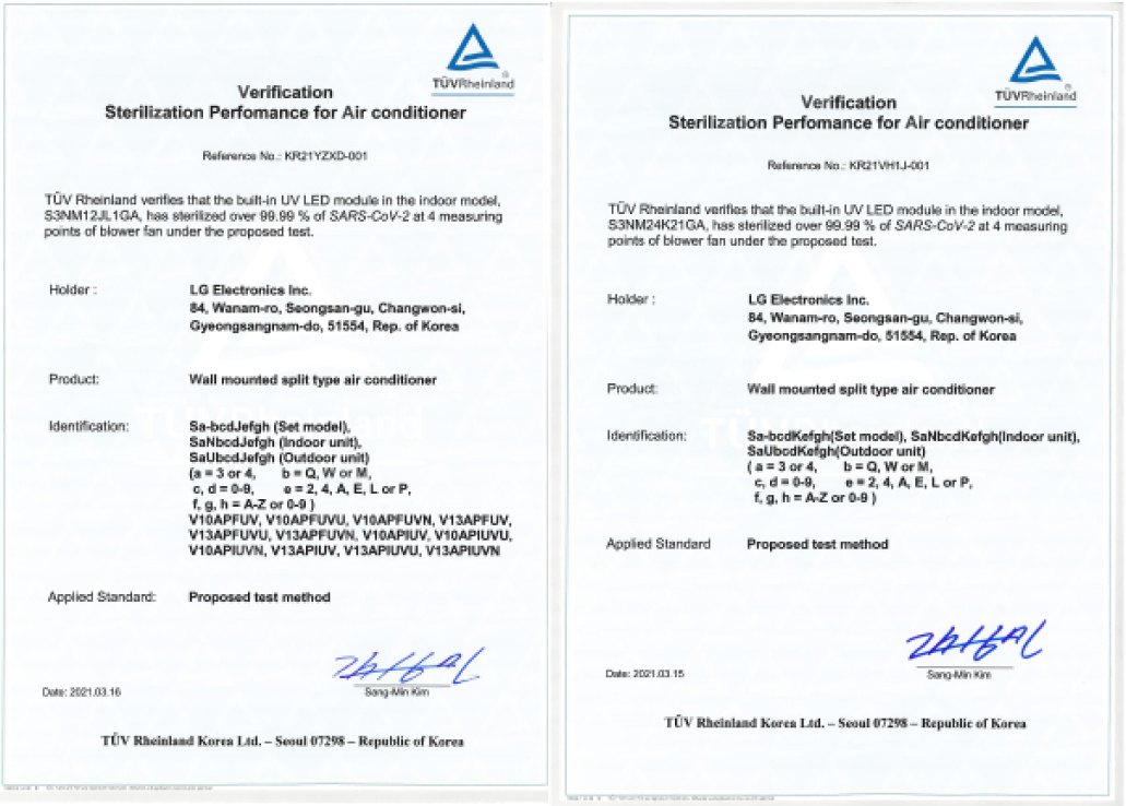 Giấy chứng nhận của Hiệp hội kiểm tra kỹ thuật TÜV Rheinland về khả năng loại bỏ vi khuẩn và khử mùi đến 99% của công nghệ UVnano diệt khuẩn.