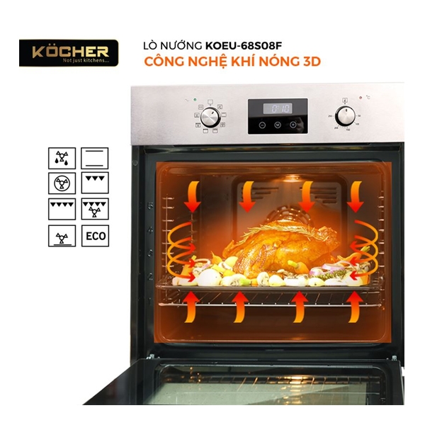Lò nướng Kocher KOEU 68S08F có dung tích là 68 lít giúp bạn thoải mái chế biến món ăn cho gia đình.