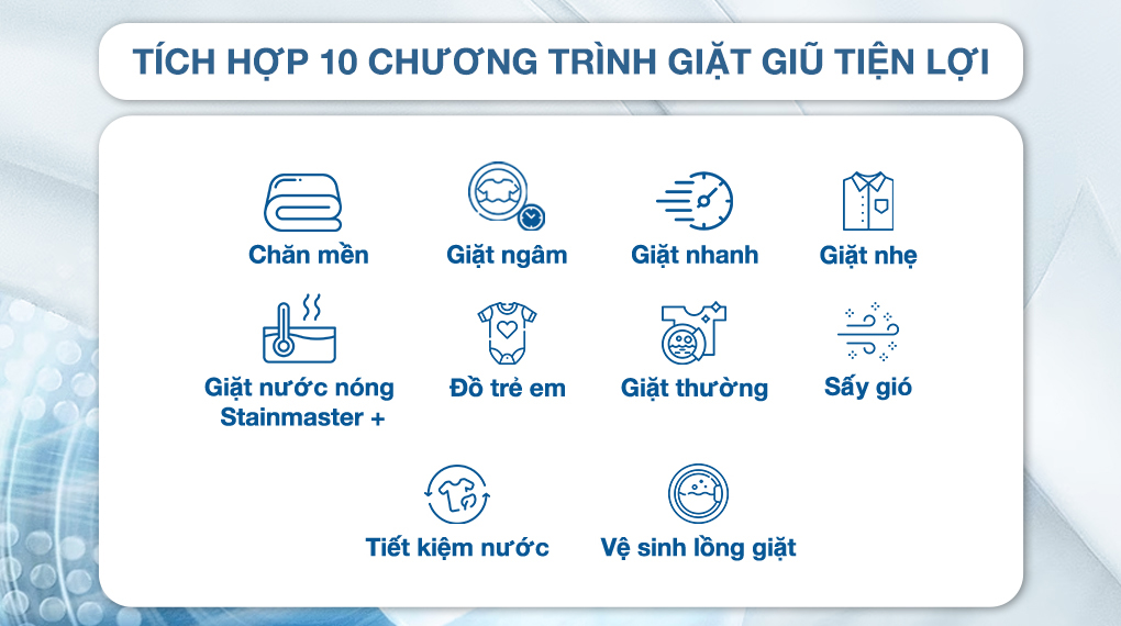 Máy giặt Panasonic Inverter 10.5 Kg NA-FD10VR1BV được thiết kế với 8 chương trình hoạt động nổi bật và 2 chương trình khác thoải mái cho bạn lựa chọn chương trình hoạt động phù hợp bao gồm: sấy gió 90 phút, giặt nước nóng StainMaster+, chăn màn, giặt nhanh, giặt ngâm, đồ trẻ em, tiết kiệm nước, vệ sinh lồng giặt (Xem chi tiết tại bảng thông số kỹ thuật). Bên cạnh chế độ giặt nước nóng StainMaster+, máy còn có chế độ giặt nhanh giúp bạn tiết kiệm được thời gian hơn trong quá trình giặt giũ.