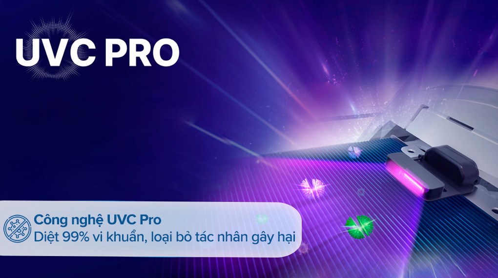 – Công nghệ UVC Pro: diệt hơn 99% virus, cho không gian sống trong lành. UVC Pro phát ra tia cực tím UVC trên bề mặt dàn bay hơi đồng thời kích hoạt các nhóm ion âm và dương ức chế vi khuẩn và virus, mang lại bầu không khí trong lành, sạch khuẩn.