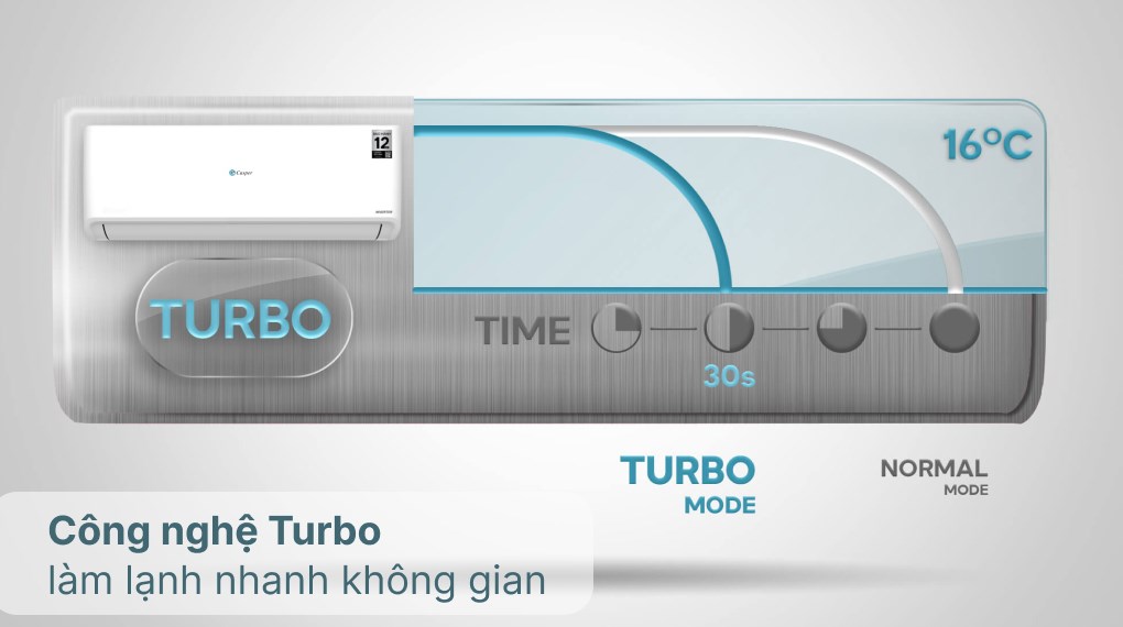 Máy lạnh Casper này được trang bị chế độ Turbo, khi được kích hoạt máy lạnh sẽ hoạt động với công suất lớn nhằm nhanh chóng đưa căn phòng đạt được nhiệt độ cài đặt, nhờ đó mang đến không gian dễ chịu, thoải mái trong thời gian ngắn cho người sử dụng.