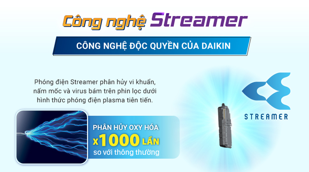 Công nghệ Streamer phân hủy vi khuẩn và nấm mốc bám trên phin lọc dưới hình thức phóng điện plasma, tạo ra những dòng electron ở tốc độ cao. Những electron này va chạm và kết hợp với nitơ, oxy để tạo ra các phân tử có khả năng phân hủy nhanh hơn 1000 lần so với phương pháp phóng điện plasma thông thường.