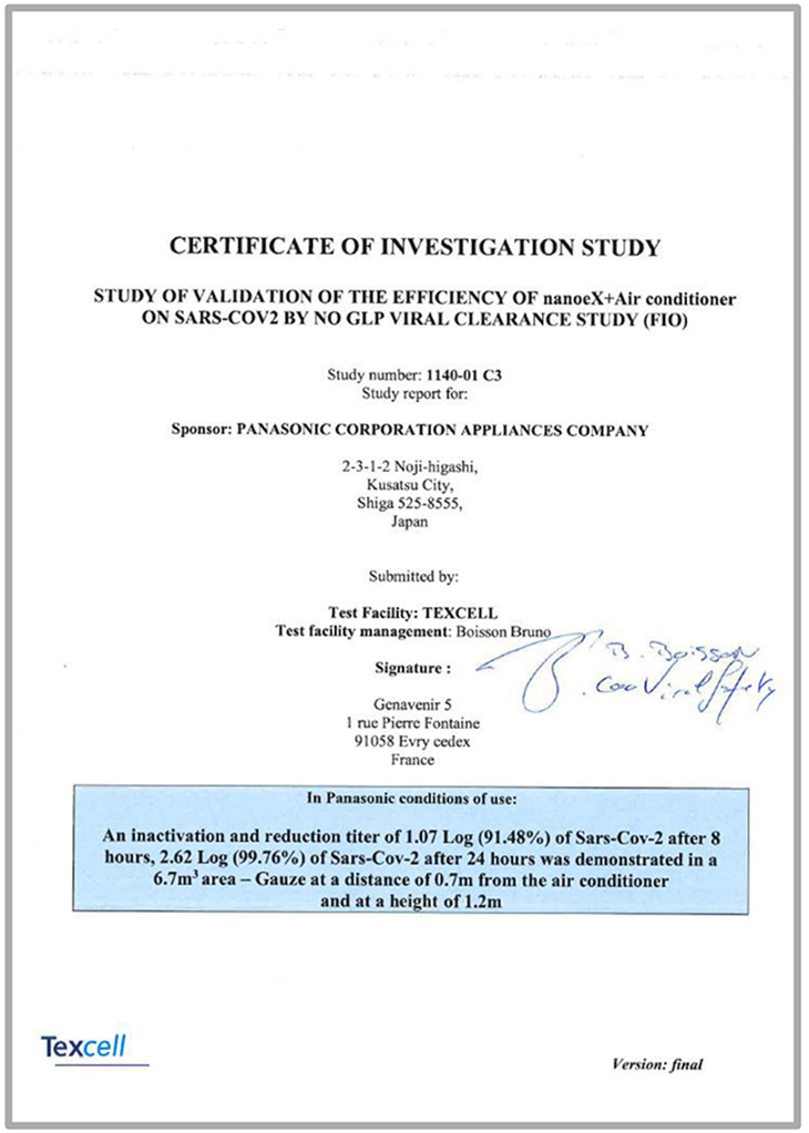 Panasonic cùng tổ chức Texcell (đây là một tổ chức nghiên cứu toàn cầu, chuyên thử nghiệm về virus) đã cho ra kết quả thử nghiệm rằng công nghệ Nanoe X có khả năng ức chế 91.4% khả năng hoạt động của vi-rút Corona trong không gian kín 6.7m3 nếu bạn bật máy lạnh trong vòng 8 giờ. Thử nghiệm này được thực hiện trong điều kiện phòng thí nghiệm kín, không được thiết kế để đánh giá trong không gian sống không được kiểm soát.