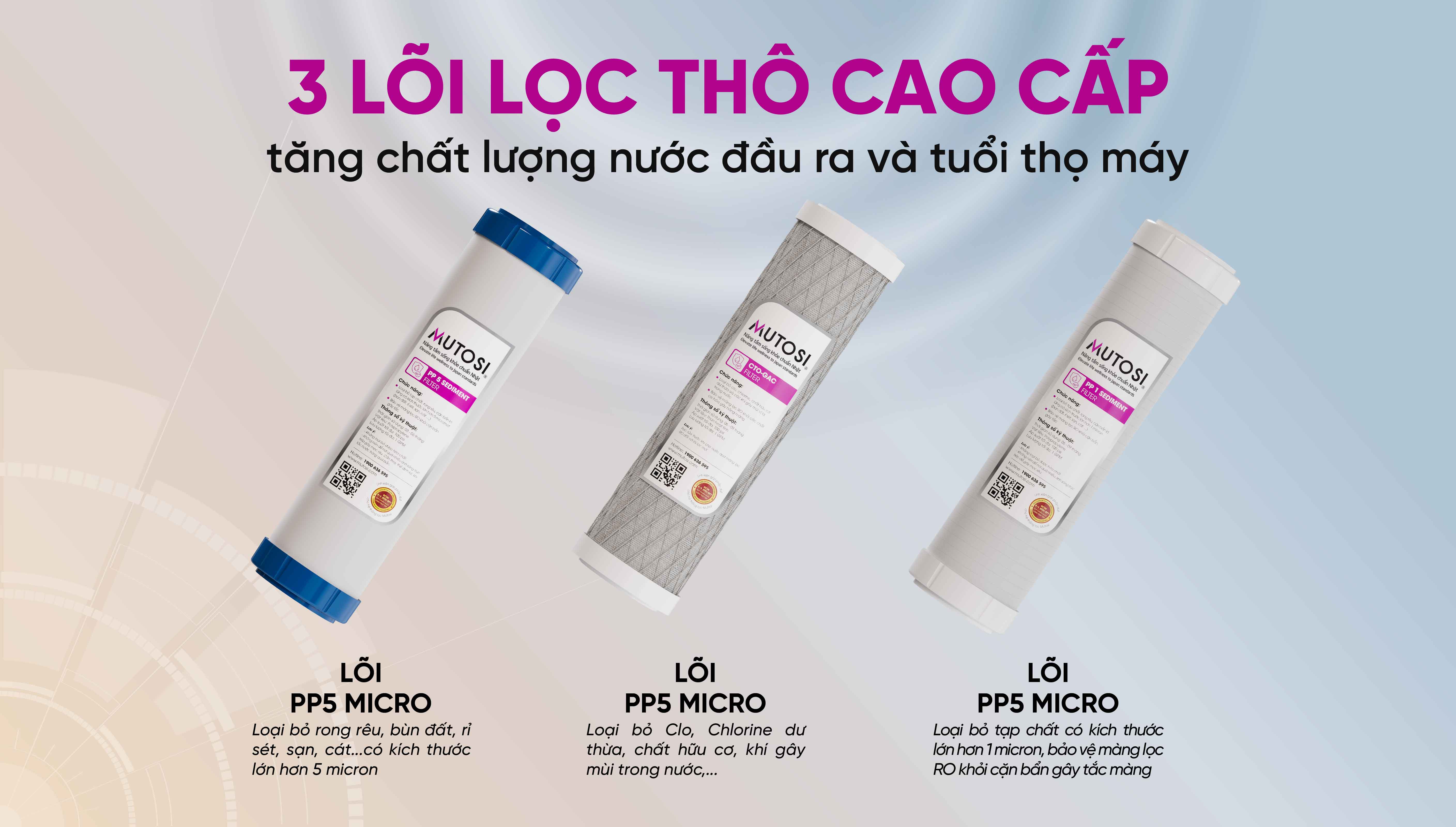 Máy lọc nước MP-S1005 được trang bị ba loại lõi lọc thô, góp phần vào quá trình bảo vệ độ bền của hệ thống lọc và tạo ra nguồn nước chuẩn tinh khiết sau lọc.