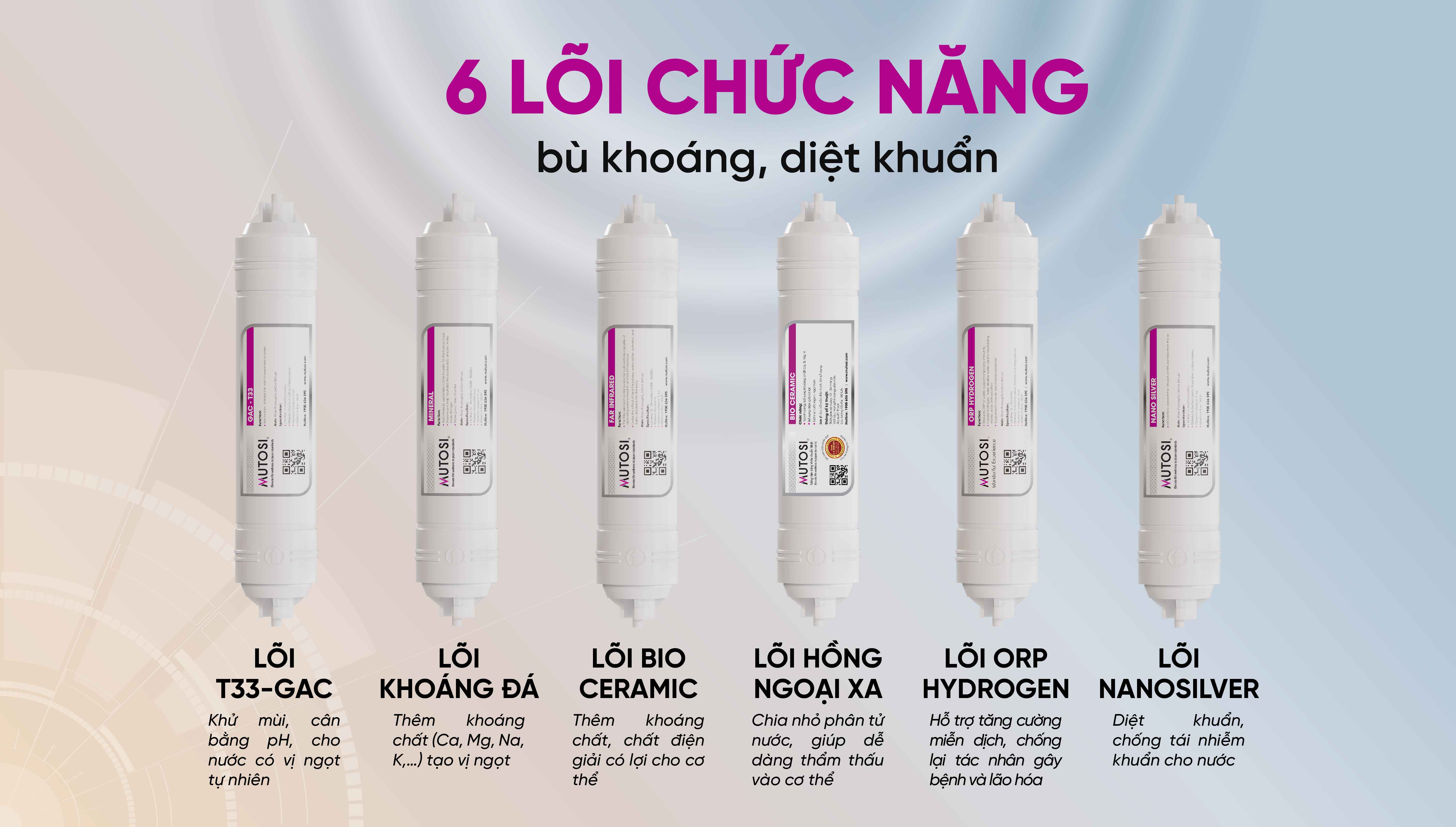 Với 6 lõi chức năng, máy lọc nước MP-S1005 cung cấp các khoáng chất cần thiết cho cơ thể và diệt khuẩn một cách hiệu quả: