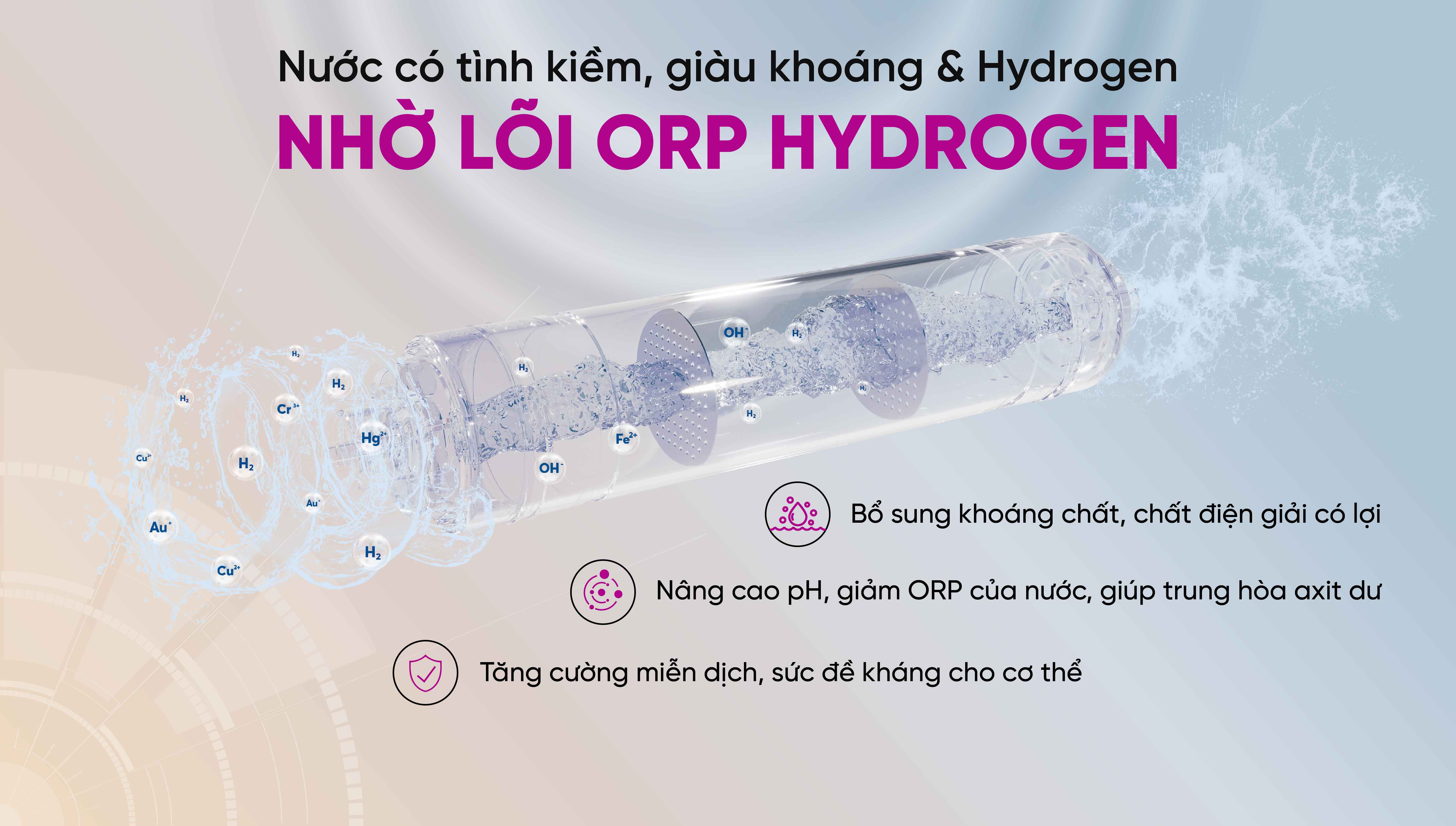 - Lõi ORP Hydrogen: Bổ sung các vi khoáng có lợi, làm tăng độ pH, giảm ORP của nước, hỗ trợ trung hòa axit dư, chống oxy hóa, tăng sức đề kháng cho cơ thể