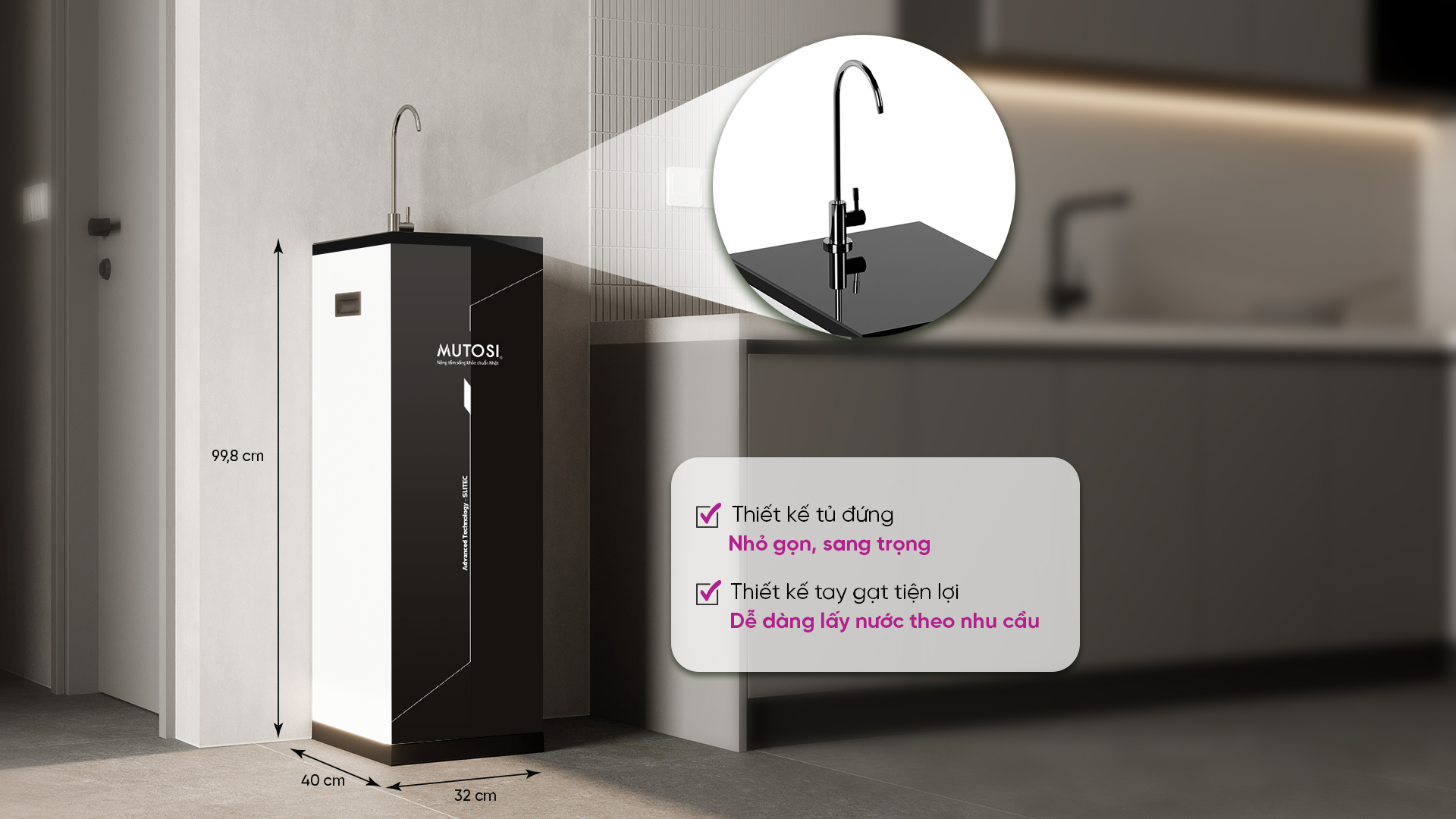 - Với kích thước chỉ 32 x 40 x 99.8 cm, máy lọc nước MP-S1005 nhỏ gọn, phù hợp với nhiều không gian bếp