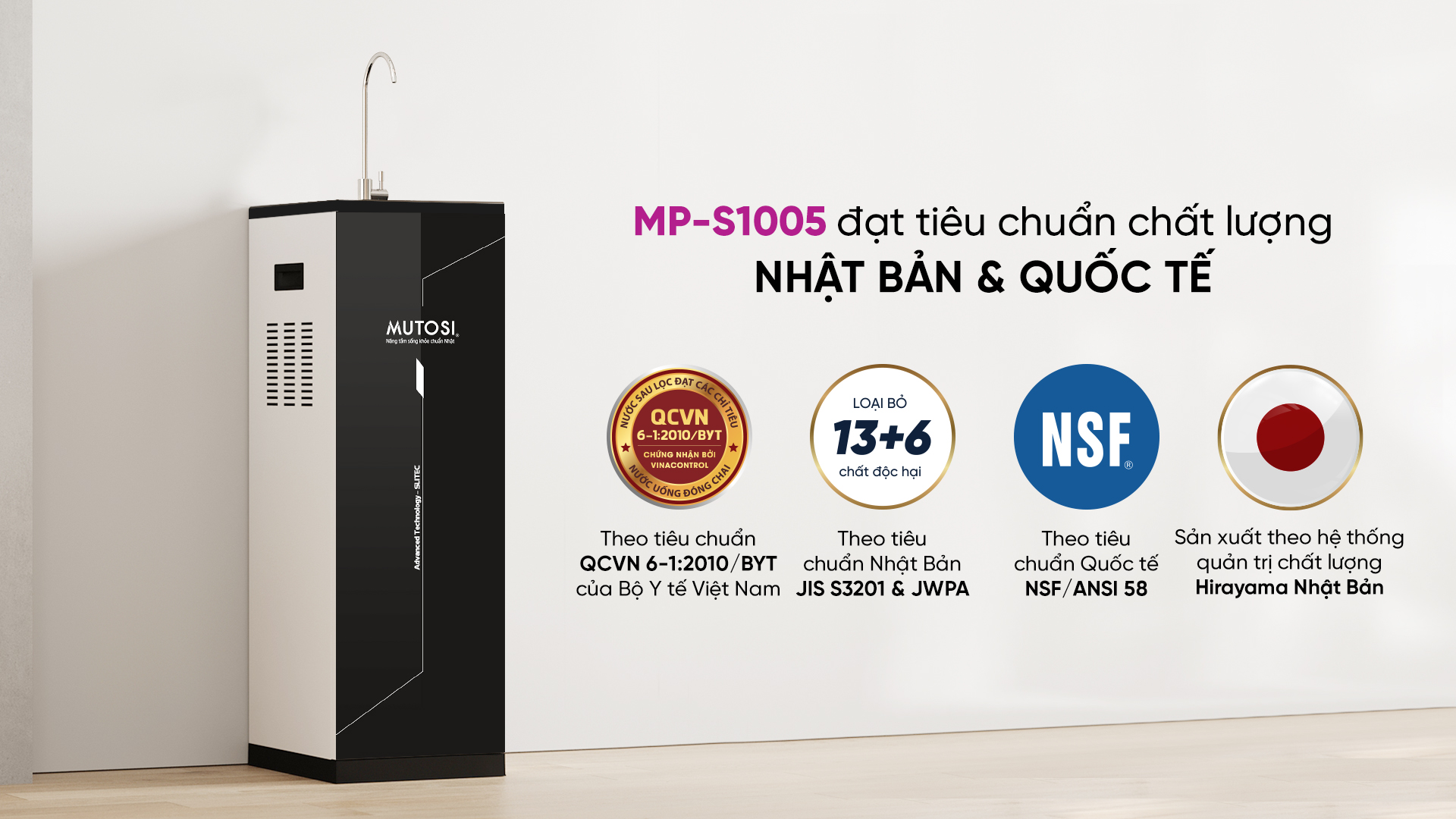 - Lọc sạch hơn với màng lọc RO Mutosi Slitec đạt chứng nhận toàn cầu NSF/ANSI 58 được cấp bởi Trung tâm hợp tác về An toàn thực phẩm và Nước uống thuộc tổ chức Y tế Thế giới