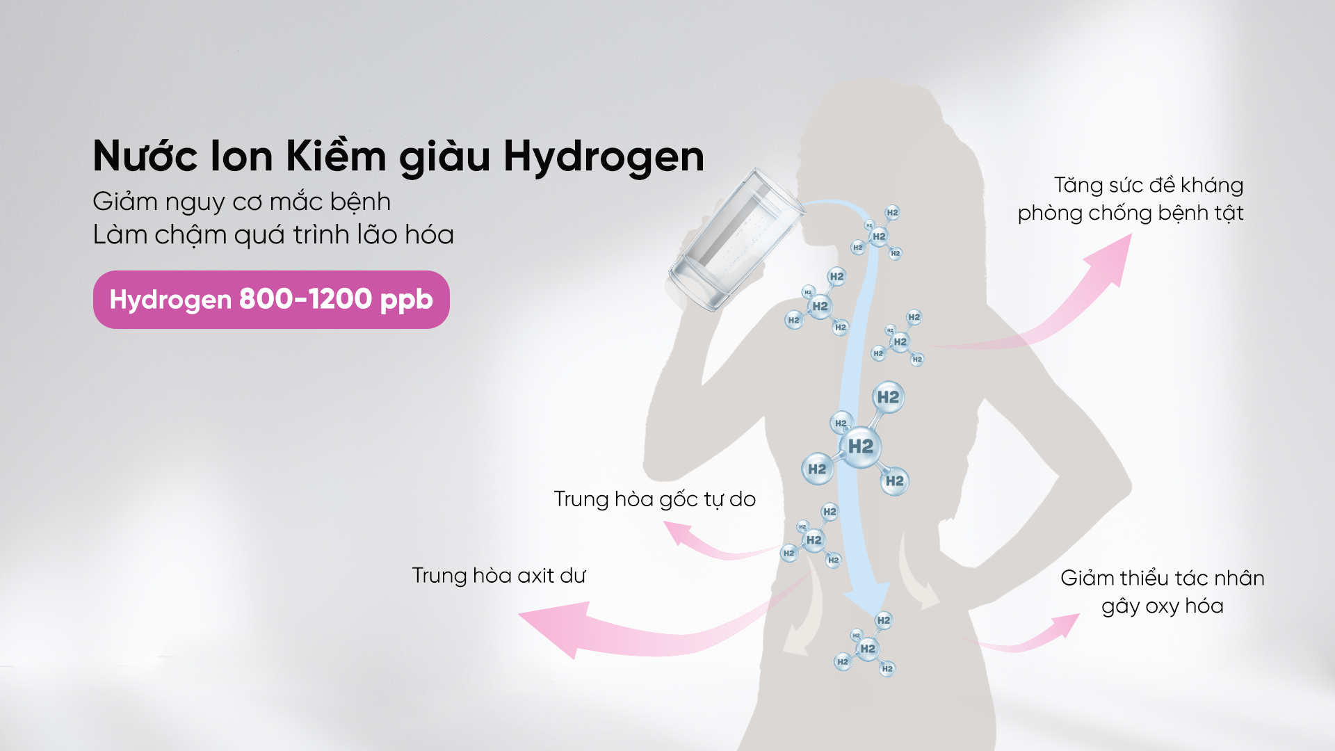 Hàm lượng Hydrogen trong nước cao tới 800-1200 ppb, hỗ trợ loại bỏ hiệu quả các gốc tự do nguy hiểm, ngăn ngừa lão hóa và tăng cường đề kháng cơ thể.