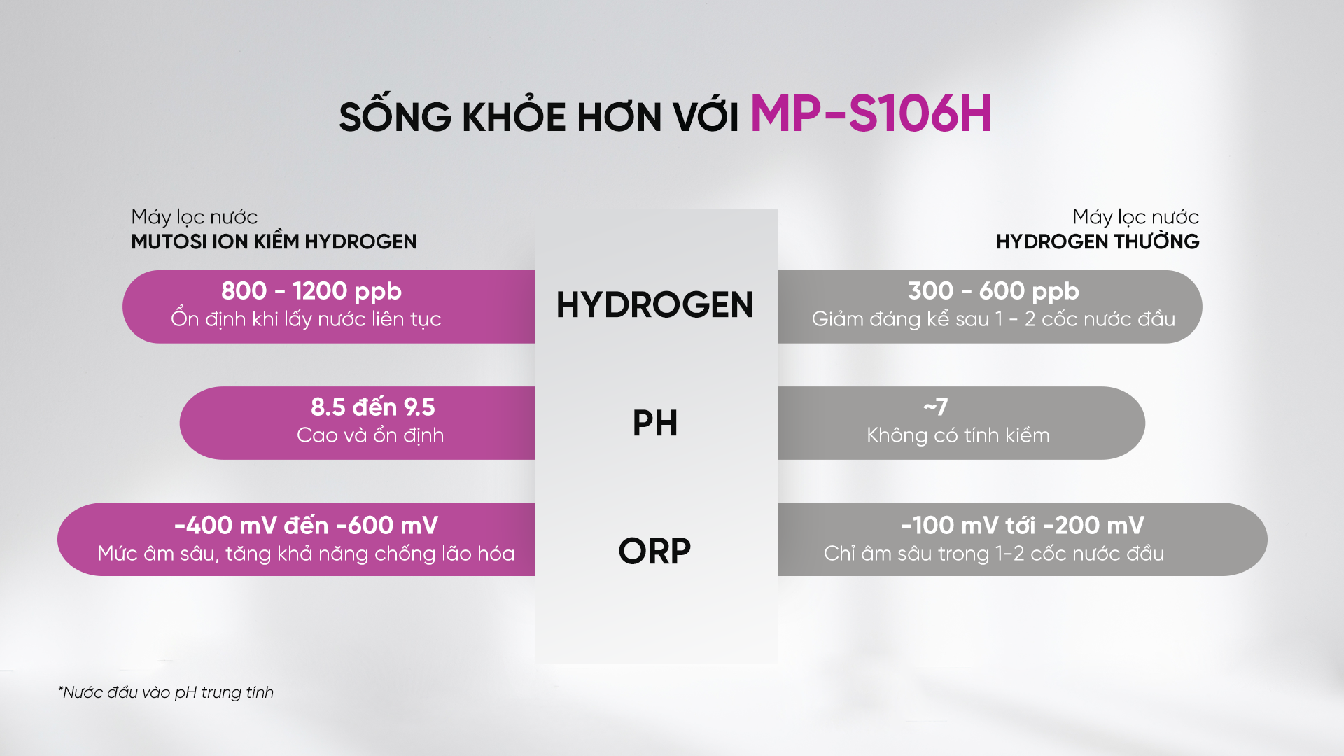 Các chỉ số Hydrogen, pH, ORP trong nước của Máy lọc nước Mutosi ION Kiềm Hygrogen MP-S106H cao và ổn định hơn so với Máy lọc nước Hydrogen thường.
