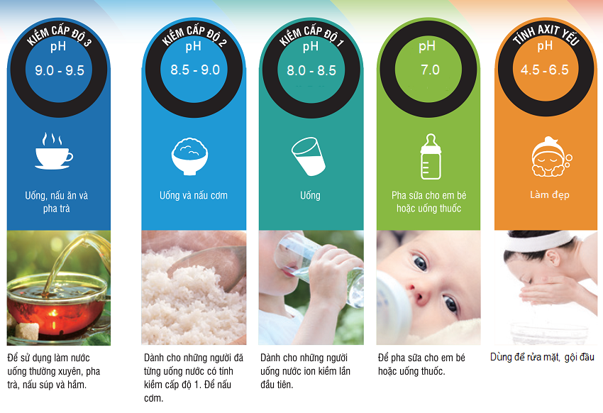 Nước iON kiềm cấp độ 3 pH ~ 9.0 – 9.5: Nước uống, pha trà, nấu súp và hầm.