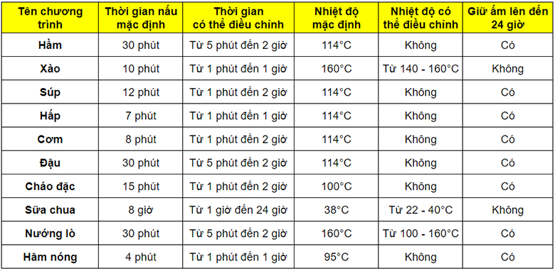 Mỗi chương trình sẽ có khoảng thời gian nấu khác nhau, bạn có thể tham khảo bảng sau: