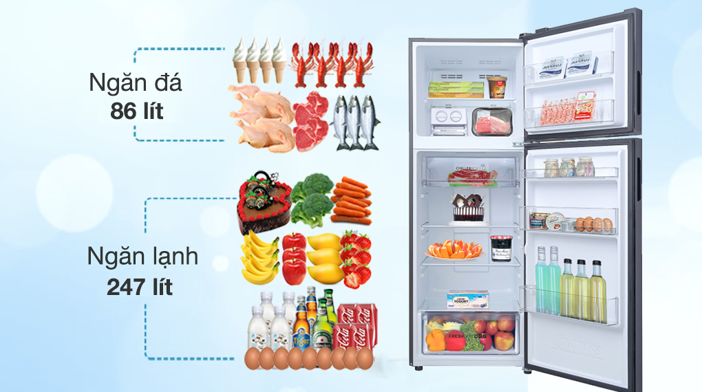 – Dung tích sử dụng 333 lít, phục vụ tốt cho nhu cầu lưu trữ thực phẩm hằng ngày của gia đình có từ 3 – 4 thành viên.