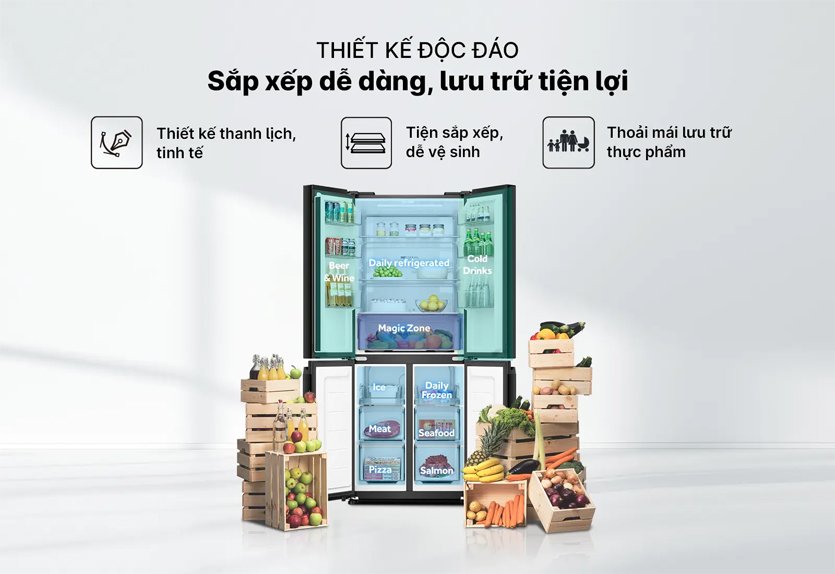 – Ngăn lạnh dung tích ngăn lạnh : bên trong tủ được thiết kế có kệ, ngăn đựng thực phẩm tươi và ngăn đựng thực phẩm khô. Ngoài ra, mỗi bên cánh cửa tủ lạnh cũng được thiết kế thêm khay chứa.- Ngăn rau Magic Zone với 3 chế độ lưu trữ linh hoạt đáp ứng các nhu cầu lưu trữ thực phẩm khác nhau.- Ngăn đá dung tích , gồm có hộp chứa đá, ngăn và hộc chứa thuận tiện cho việc phân loại thực phẩm.