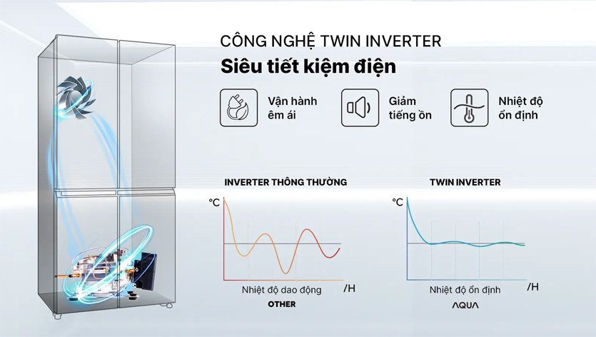 Tủ lạnh AQR-M532XA(CBC) được trang bị công nghệ Twin Inverter, giúp máy hoạt động êm ái và giảm tiếng ồn đáng kể. Công nghệ này không chỉ tạo ra môi trường yên tĩnh trong không gian sống mà còn duy trì nhiệt độ ổn định bên trong tủ lạnh. Công nghệ Twin Inverter cũng giúp tủ lạnh hoạt động hiệu quả với việc tiết kiệm điện năng tối ưu.