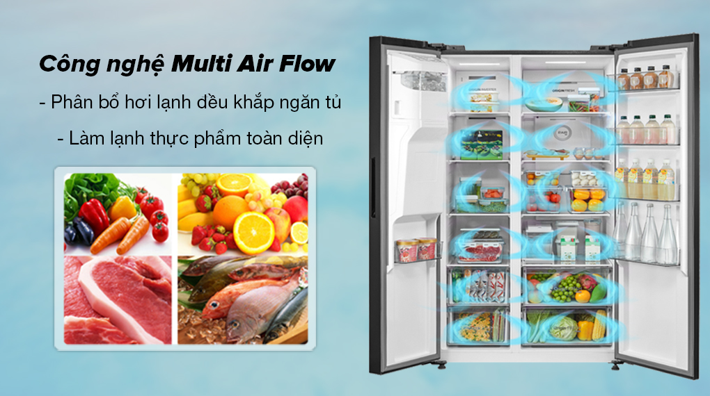 – Luồng khí lạnh đa chiều Multi Air Flow: Khí lạnh được tỏa đều từ nhiều cửa thoát hơi lạnh bên trong tủ, giúp thực phẩm được làm lạnh toàn diện nhằm giảm thiểu tình trạng hư hỏng do không đủ độ lạnh giữa các ngăn.